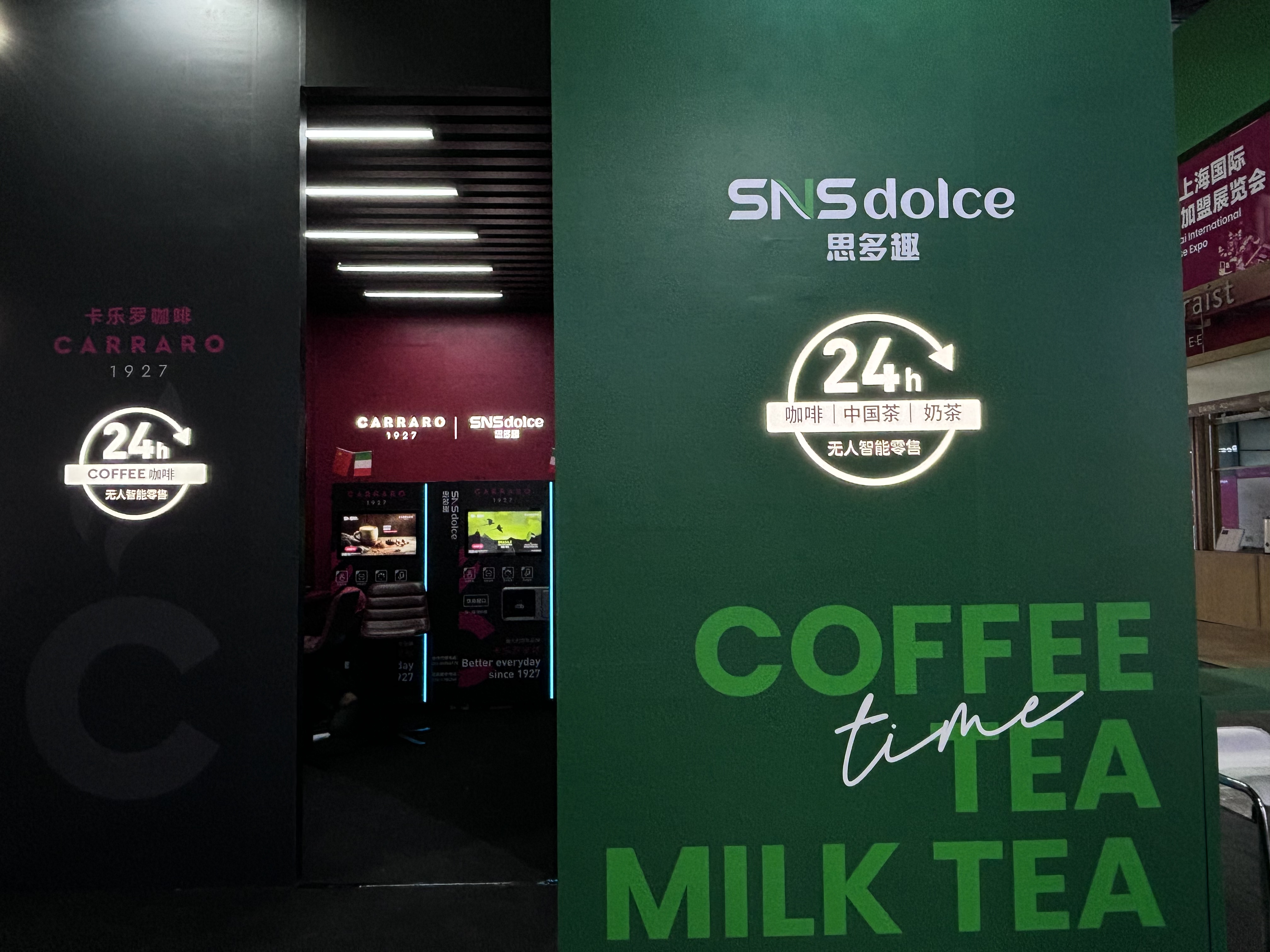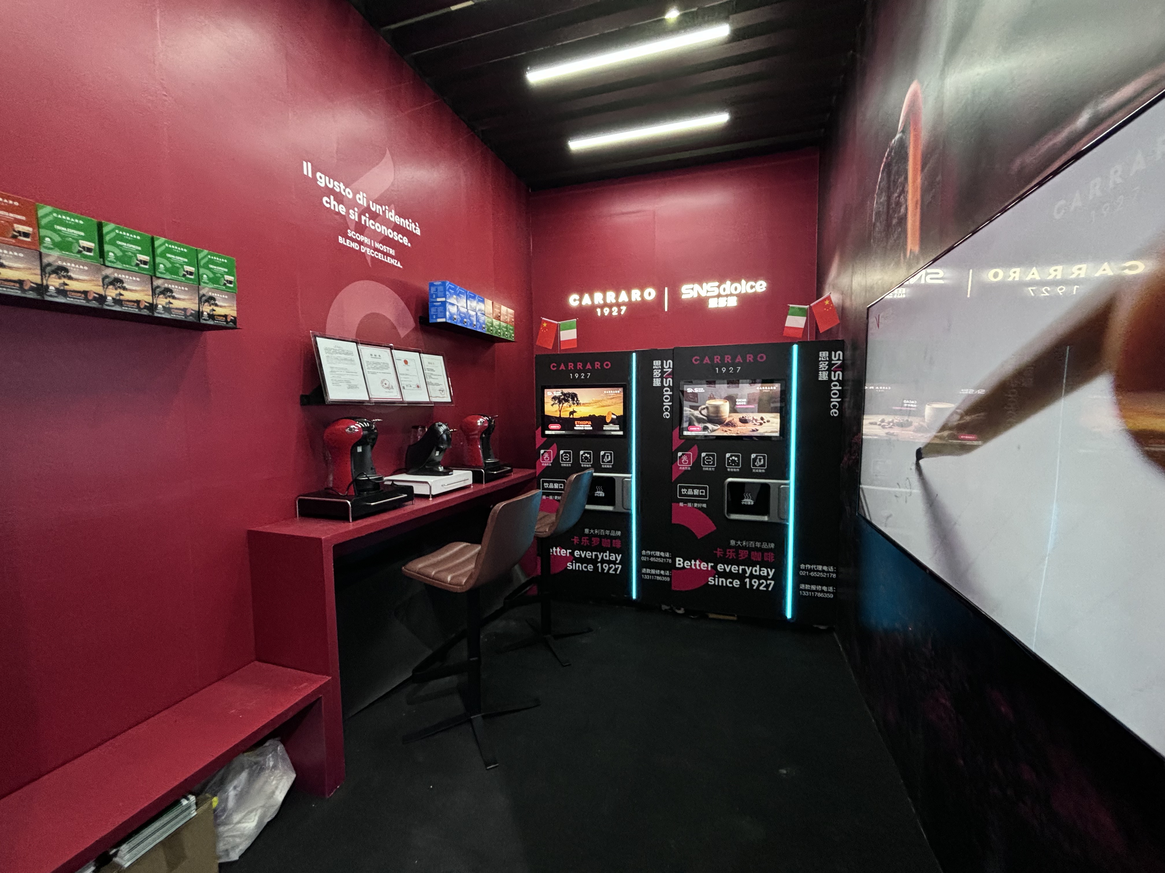 該展位融合了意大利百年咖啡品牌 **CARRARO(卡樂羅,始于 1927 年)與自有品牌SNSdolce(思多趣)** 的資源優(yōu)勢,打造了 “咖啡 + 中國茶 + 奶茶” 的多元產(chǎn)品矩陣。展區(qū)設(shè)計(jì)上,以紅、綠為主色調(diào)劃分功能區(qū)域:紅色區(qū)域集中展示 CARRARO 的咖啡產(chǎn)品系列,包括咖啡豆、咖啡設(shè)備等,墻面的意大利語標(biāo)語凸顯品牌的意式血統(tǒng);綠色區(qū)域則突出思多趣的 24 小時(shí)無人智能零售概念,配備的智能咖啡機(jī)支持多品類飲品制作,體現(xiàn) “便捷化、智能化” 的消費(fèi)體驗(yàn)升級。