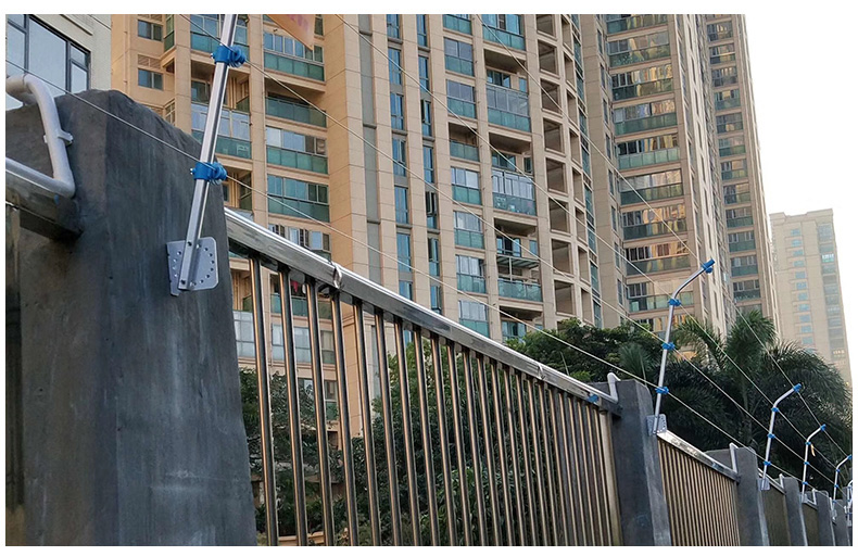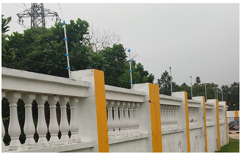 電子圍欄的阻擋作用首先體現(xiàn)在威懾功能上,金屬線上懸掛警示牌,一看到便產(chǎn)生心理壓力,且觸碰圍欄時會有觸電的感覺,足以令入侵者望而卻步;其次電子圍欄本身又是有形的屏障,安裝適當(dāng)?shù)母叨群徒嵌?,很難攀越;如果強行突破,主機會發(fā)出報警信號。