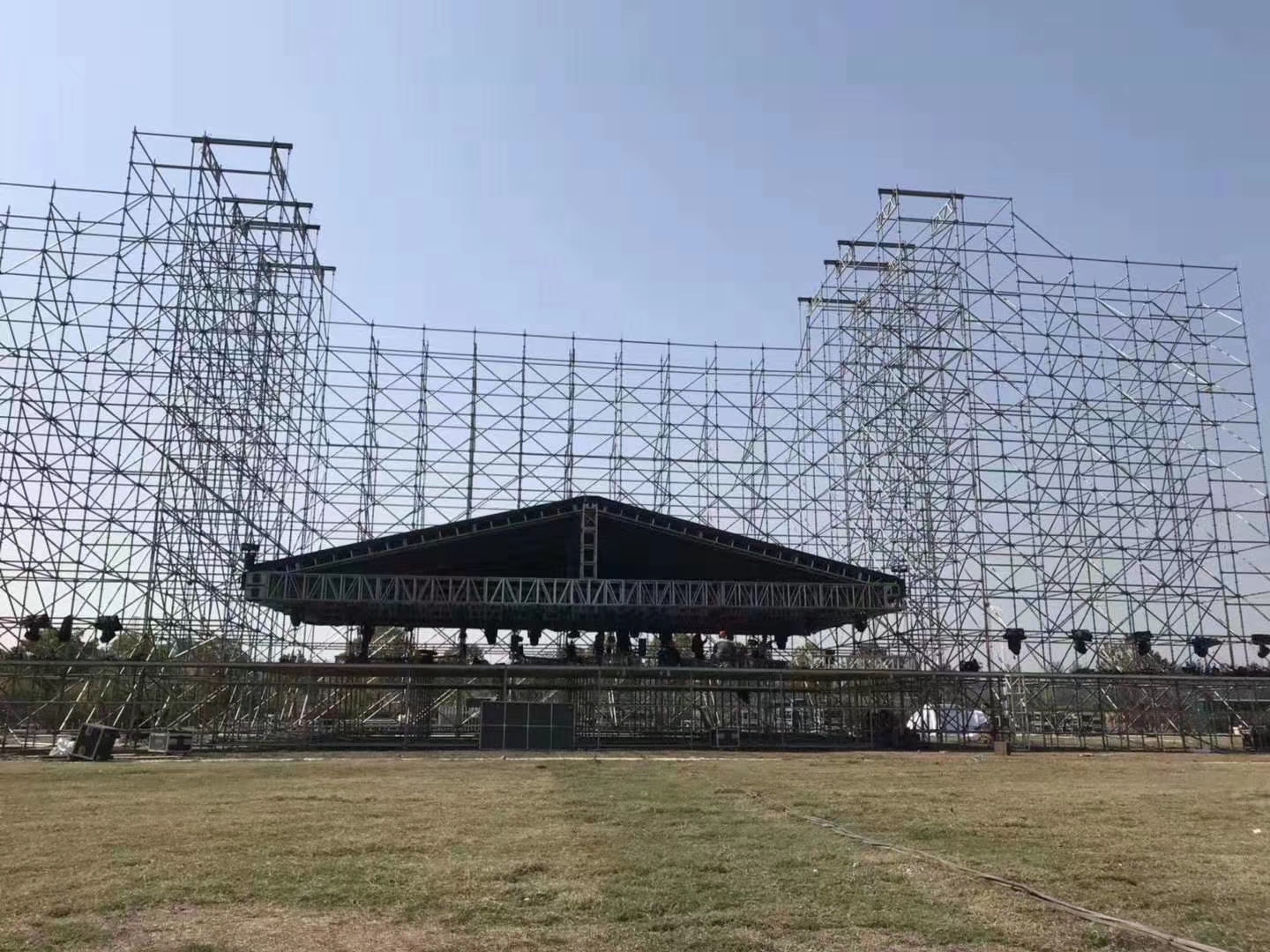 雷亞架主要用于大型演唱會(huì)的燈光架、背景架。支撐架分為立桿及橫桿、斜桿,圓盤(pán)上有八個(gè)孔,四個(gè)小孔為橫桿專用;四個(gè)大孔為斜桿專用。橫桿、斜桿的連接方式均為插銷式的,可以確保桿件與立桿牢固連結(jié)。橫桿、斜桿接頭特別依管的圓弧制造,與立桿鋼管呈整面接觸,敲緊插銷后,呈三點(diǎn)受力( 接頭上下二點(diǎn)及插銷對(duì)圓盤(pán)一點(diǎn))可牢牢固定增加結(jié)構(gòu)強(qiáng)度并傳遞水平力,橫桿頭與鋼管身采用滿焊固定,力量傳遞無(wú)誤。而斜桿頭為可轉(zhuǎn)動(dòng)接頭,以鉚釘將斜桿頭與鋼管身固定。至于立桿的連接方式是以四方管連接棒為主,而連接棒已固定在立桿上,不用另外的接頭組件來(lái)組合,可省卻材料遺失及整理的麻煩。